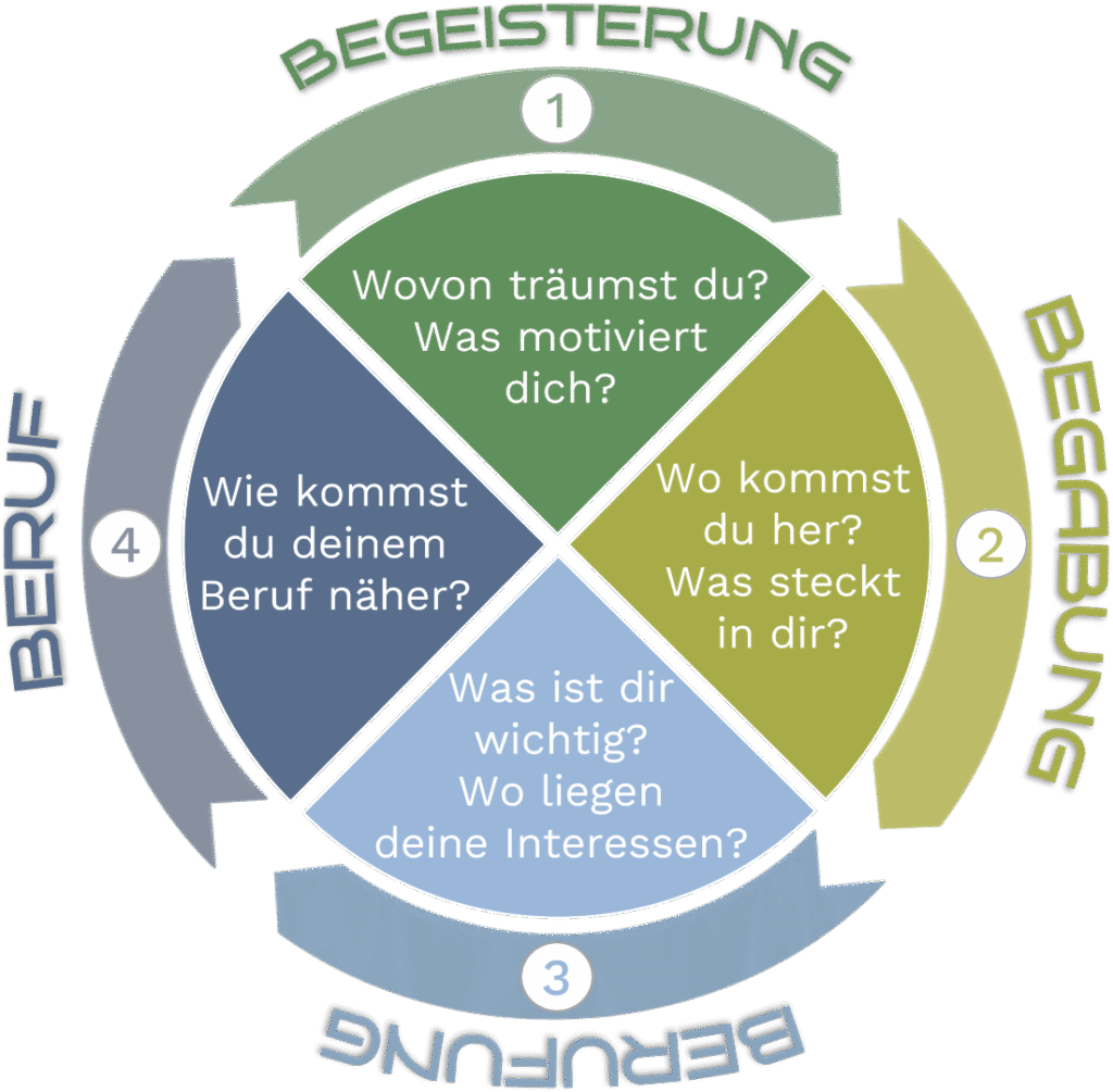 Im ersten Modul Begeisterung, geht’s um das, was dich wirklich antreibt, also was macht dir so richtig Spaß. Wir schauen uns deine Kindheitsträume, deine Hobbys und deine Stärken an – also die Dinge, die dir Freude bereiten und dir leichtfallen. Mit dem Stärken-Test findest du heraus, welche Aktivitäten dich begeistern. Das Ziel: Einen Beruf finden, der nicht nur Arbeit ist, sondern dir Spaß macht und dich motiviert.